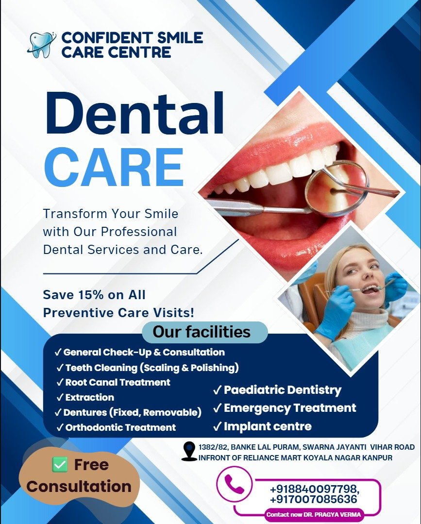 Confident Smile Dental Care Centre is committed to providing high-quality dental treatment with a patient-first approach. Under the care of Dr. Pragya Verma, we offer complete dental solutions using modern equipment, strict hygiene standards, and personalized treatment plans.